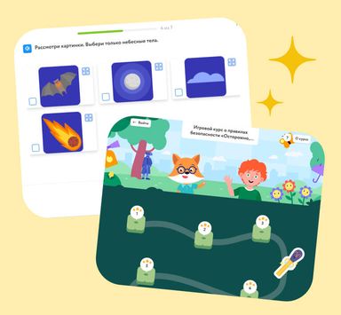 в каждом уроке есть сюжет и интерактивные задания, а в личном кабинете ребёнка будет ждать персонаж, которого можно прокачивать